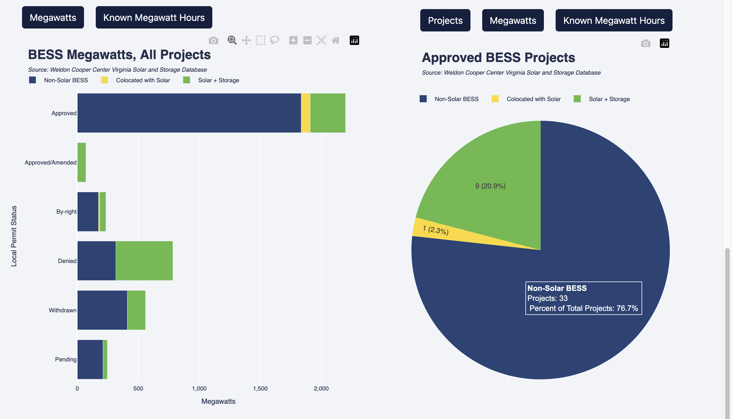 The Virginia Solar and Storage Database (VSSD) provides an inventory of large-scale solar projects and battery energy storage systems (BESS) proposed for siting approval at the local level in Virginia. Its purpose is to provide information on the status of local permitting, details about project characteristics and attributes, and to provide a mechanism to link projects and track development trends across local, state, and interconnection permitting.